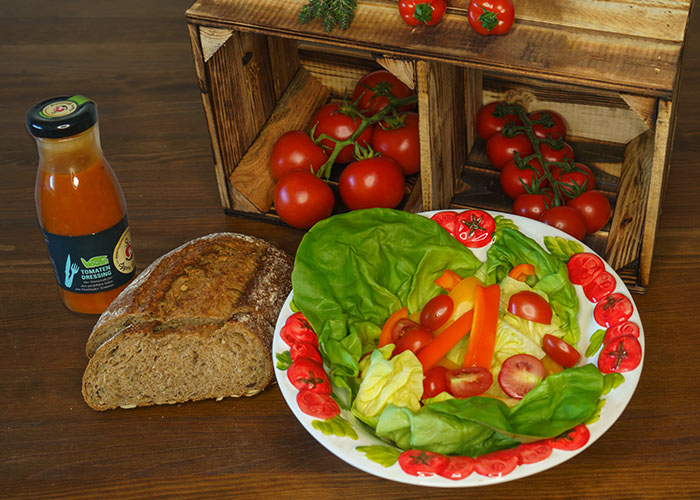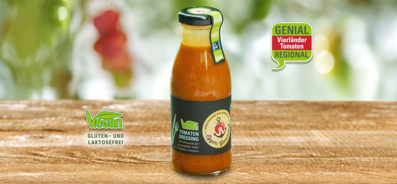Unser feines Tomaten-Dressing besteht aus fein-würzigen Vierländer-Tomaten, Rapsöl, Wasser, Branntweinessig, SENFkörner, BRAUNSENFSAAT, Zucker, Essigessenz, Sonnenblumenöl, Zwiebeln, Salz, Kräuter, modifizierter Stärke, Verdickungsmittel: Guarkernmehl, Xanthan - geschmacklich abgestimmt mit feinen Gewürzen. Das Dressing ist vegan, gluten- und laktosefrei.
