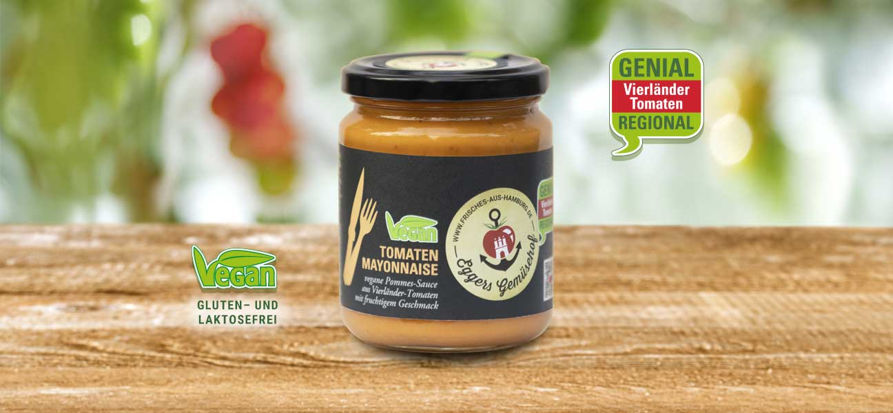 Unsere vegane Tomaten-Mayonnaise besteht aus fruchtigen Vierländer-Tomaten, Salz, Zucker, Wasser, Branntweinessig, Sonnenblumenöl, Zwiebeln, modifizierte Stärke, Rapsöl, SENFkörner, BRAUNSENFsaat, Gewürze und Dextrose. Als Verdickungsmittel verwenden wir Guarkernmehl und Xanthan.